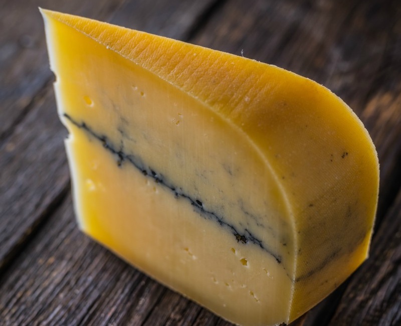 A sajt története nagyon érdekes. A hagyomány szerint az 1600-as években a sajtkészítő teje nem volt elég egy sajthoz, ezért az esti fejés után elkészített gurigát lekente szénnel, és a reggeli fejésből elkészített friss sajtot ráfordította, majd összepréselte és így érlelte meg. Ez a dekoratív sajt rendkívül népszerű termékünk, krémes, lágy ízű, kellemesen édes. Bár az eredeti sajt 6kg körüli, mi ezt is 9-10 kg-os gurigákban készítjük. Minimum 4 hónapos érlelés után bontjuk fel.