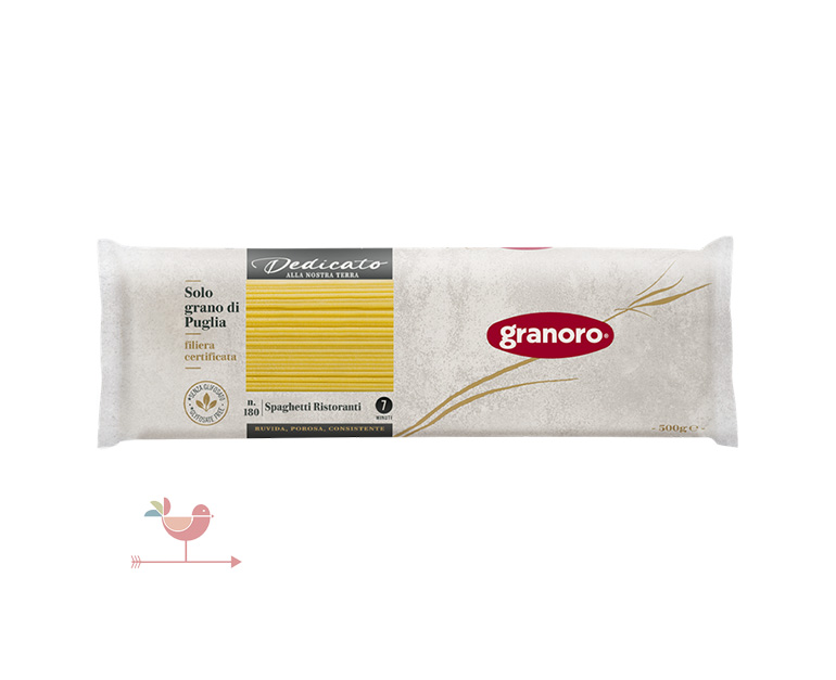 A Granoro Dedicato márka létrehozásával a cég a pugliai mezőgazdaságot és a helyi gazdákat támogatja. A Dedicato termékek 100%-ig pugliai alapanyagokból készülnek. Helyi alapanyagok, helyben készítve.
