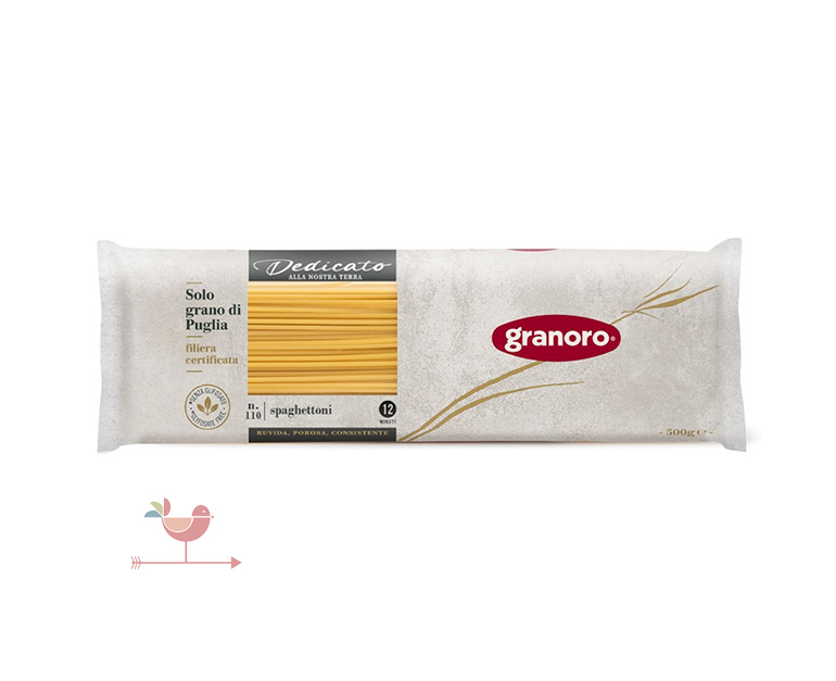 A Granoro Dedicato márka létrehozásával a cég a pugliai mezőgazdaságot és a helyi gazdákat támogatja. A Dedicato termékek 100%-ig pugliai alapanyagokból készülnek. Helyi alapanyagok, helyben készítve.